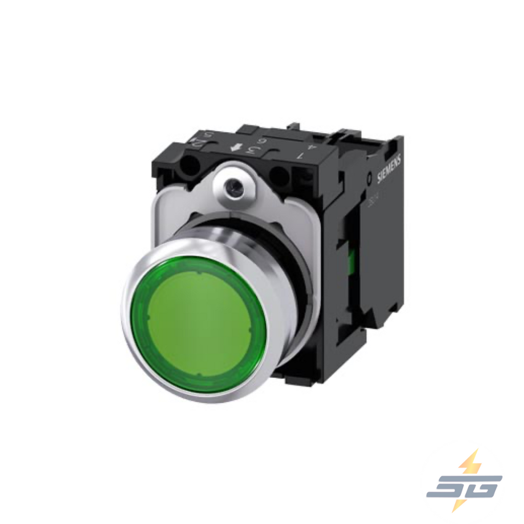 BOTON pulsador luminoso, 22 mm, redondo, metal, brillante, verde, rasante, momentáneo, con soporte, 1 NA. 24 V AC/DC, borne de tornillo