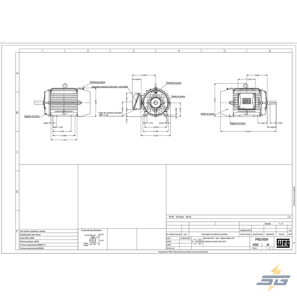 MOTOR ELECTRICO TRIFÁSICO W22 SEVERE DUTY NEMA PREMIUM (TEFC) MARCA WEG , 15HP, 4 POLOS, VOLTAJE 208-230/460V 60HZ. ESTANDAR, ARMAZîN DE HIERRO 254/6T
